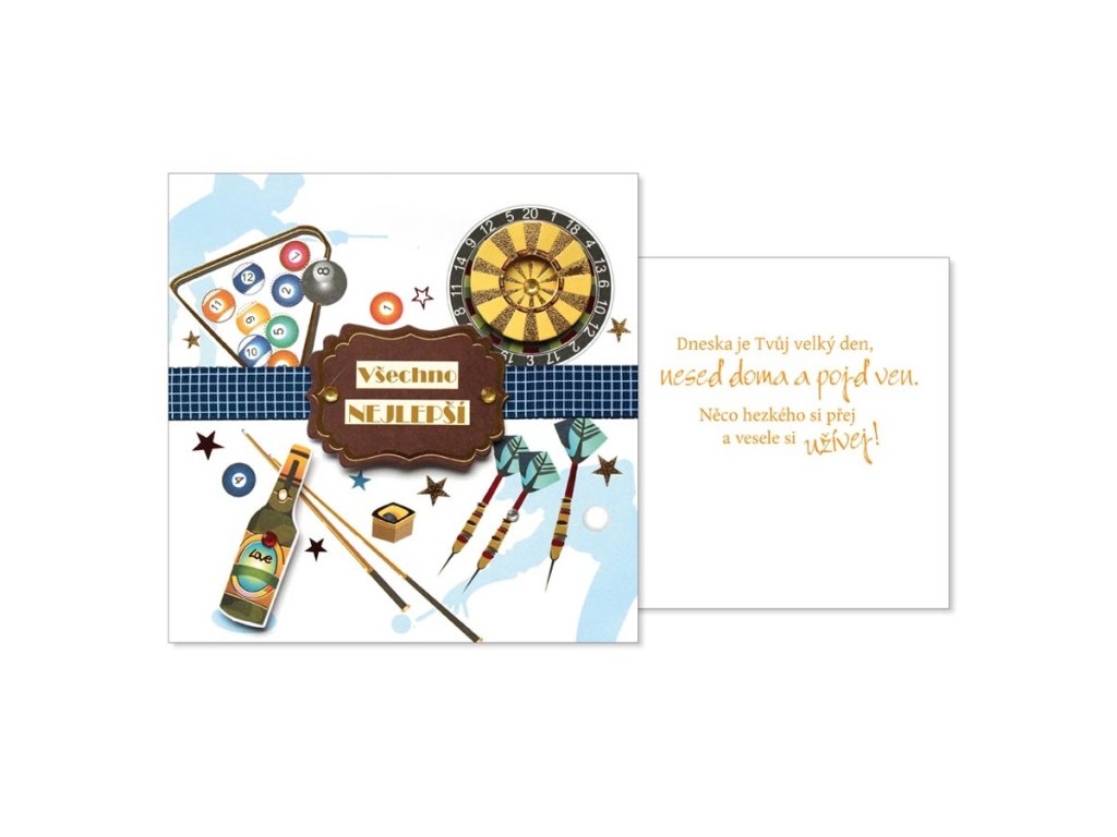 - vnitřní text: "Dneska je Tvůj velký den, neseď doma a pojď ven. Něco hezkého si přej a vesele si užívej!"