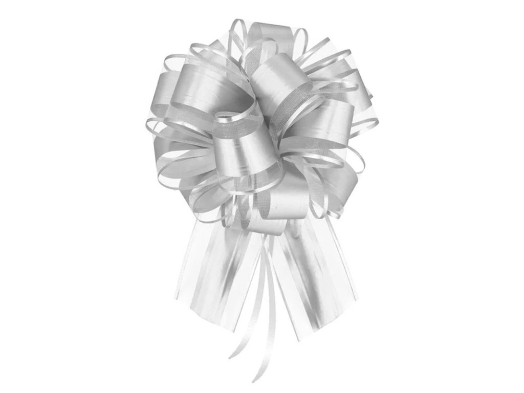 Velká mašle na dárek v metalickém stříbrném provedení se stahovacím provázkem - praktický a stylový způsob, jak rychle ozdobit jakýkoliv dárek! Aby se mašle při přepravě nezmačkala, dodáváme ji zabalenou v sáčku na plocho - sestavení je velmi snadné - stačí zatáhnout za připravené stužky a během pár vteřin je připravena k přivázání na darovaný předmět. Délka dvou provázků po stáhnutí mašle je 120cm a velikost samotné mašle 20 x 15,5cm, takže se skvěle hodí na ozdobení větších věcí. Uvedená cena je za 1 kousek.