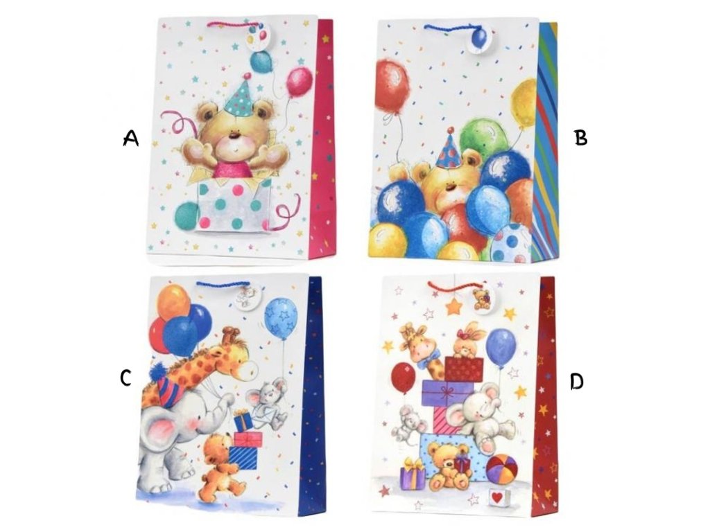 Něco dostat je skvělá věc - a když je to něco ještě ke všemu hezky zabalené, pak je to vyloženě fantazie. Nemáte čas balit dárek do balícího papíru nebo si nejste jisti svým balícím umem? Tak právě pro Vás máme tyto krásné dárkové tašky, se kterými to budete mít bez práce. Taška je opatřena pevnými uchy pro snadné nošení a kartičkou, na kterou můžete napsat jméno nebo krátké věnování. Tašky jsou v nabídce ve čtyřech různých designech. Pokud si přejete konkrétní motiv, napište prosím do poznámky v objednávce jeho označení a/b/c/d. Uvedená cena je za jednu tašku o velikosti 18 x 23 x 9,8cm.