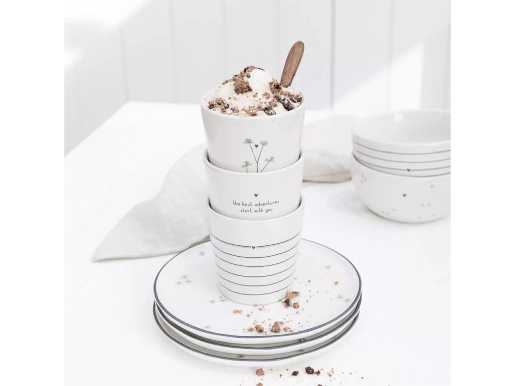Krásný keramický hrneček bez ouška pro hezčí den! Ať už si do něj připravíte cappuccino, čaj, nebo horkou čokoládu, určitě si náramně pochutnáte. Vhodný je také na studené nápoje - a co víc, velkou parádu udělá jako kelímek na psací potřeby nebo obal na menší květiny. Holandští designéři navrhli toto nádobí tak, aby se dalo snadno kombinovat - každý motiv je originální, přesto k sobě dokonale ladí. Elegance, nadčasovost a malé srdíčko, které se prolíná celou kolekcí. Právě díky svému jednoduchému designu se bude hrníček hodit jak k dalším kouskům z naší kolekce, tak i k nádobí, které už máte v kuchyni. Kelímek má silné stěny, můžete jej směle dát do myčky na nádobí i mikrovlnné trouby. Udělejte radost sobě nebo potěšte někoho blízkého a vychutnejte si společně každý doušek naplno ♥