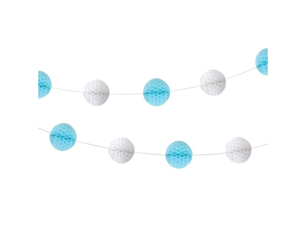 Papírové girlandy patří mezi nejoblíbenější prostorové dekorace. Vše je připraveno - stačí najít dva záchytné body a jejich zavěšení zvládnete během pár minut! Na bílém provázku je navázáno celkem 20 kouliček v bílé a světle modré barvě, které snadno rozvinete jedním tahem a upevníte nainstalovanou samolepkou. Průměr jedné kuličky je 4,5cm. Svou party můžete směle vyzdobit celými 250cm této závěsné dekorace - přesně tolik se nachází v jednom balení. Stylová Pompom girlanda bude už z dálky lákat hosty k místu dění, skvěle se hodí na oslavu narozenin a určitě ji využijete také jako svatební dekoraci - například k ozdobení Sweet baru. A aby toho nebylo málo, girlandu můžete naaranžovat také jako součást pozadí party fotokoutku!