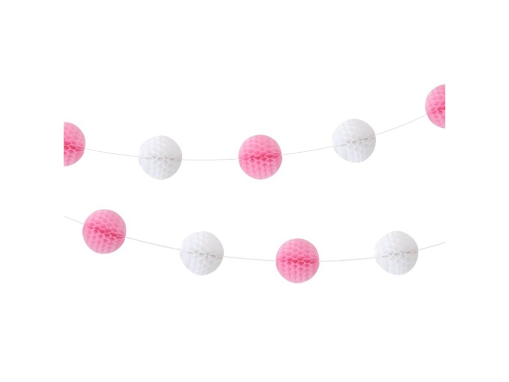 Papírové girlandy patří mezi nejoblíbenější prostorové dekorace. Vše je připraveno - stačí najít dva záchytné body a jejich zavěšení zvládnete během pár minut! Na bílém provázku je navázáno celkem 20 kouliček v bílé a růžové barvě, které snadno rozvinete jedním tahem a upevníte nainstalovanou samolepkou. Průměr jedné kuličky je 4,5cm. Svou party můžete směle vyzdobit celými 250cm této závěsné dekorace - přesně tolik se nachází v jednom balení. Stylová Pompom girlanda bude už z dálky lákat hosty k místu dění, skvěle se hodí na oslavu narozenin a určitě ji využijete také jako svatební dekoraci - například k ozdobení Sweet baru. A aby toho nebylo málo, girlandu můžete naaranžovat také jako součást pozadí party fotokoutku!