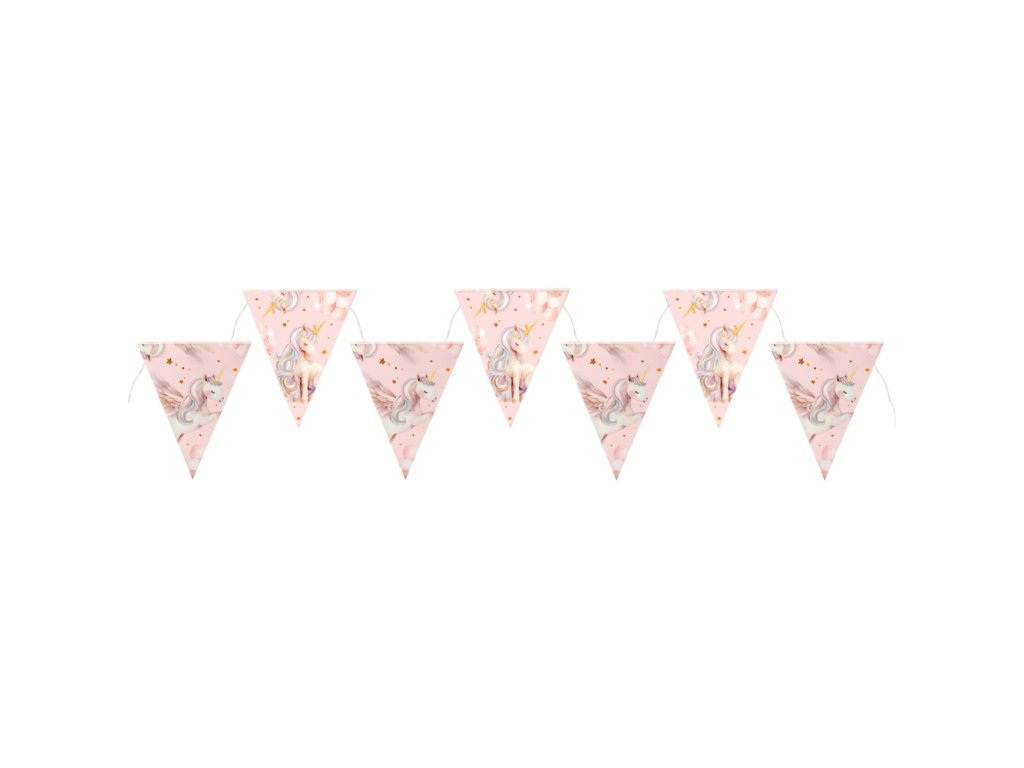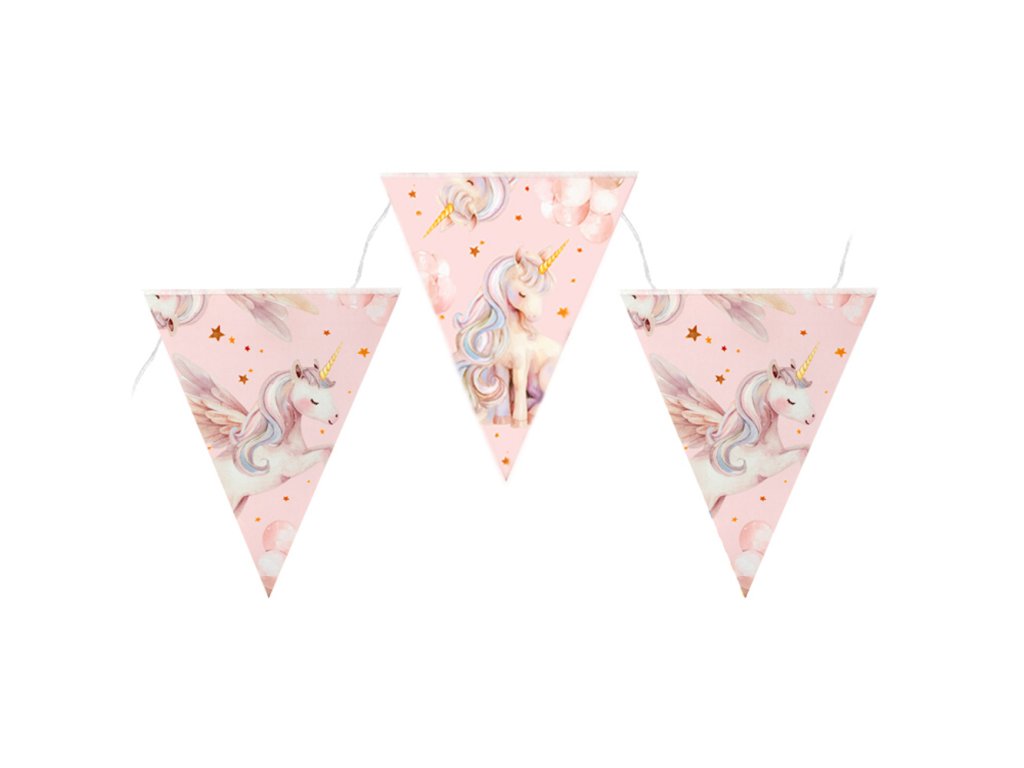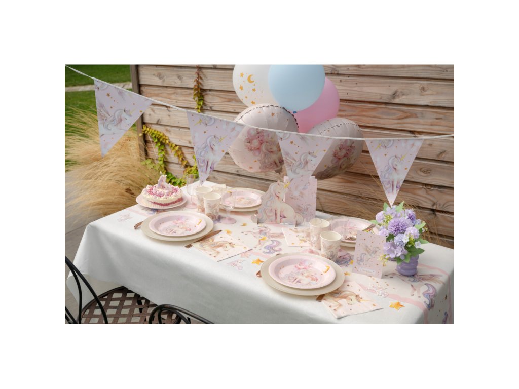 Papírové girlandy patří mezi nejoblíbenější prostorové dekorace. Vše je připraveno - stačí najít dva záchytné body a jejich zavěšení zvládnete raz dva! Na bílé stuze je navázáno celkem 7 papírových vlaječek s barevným potiskem jednorožců. Velikost jedné vlajky je 22 x 26cm a celková délka 300cm. Stylová vlaječková girlanda bude už z dálky lákat hosty k místu dění. Parárdní výzdoba na tématickou oslavu s jednorožci!
