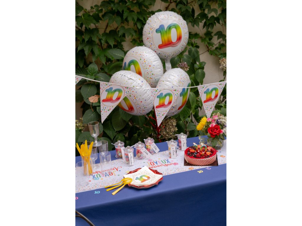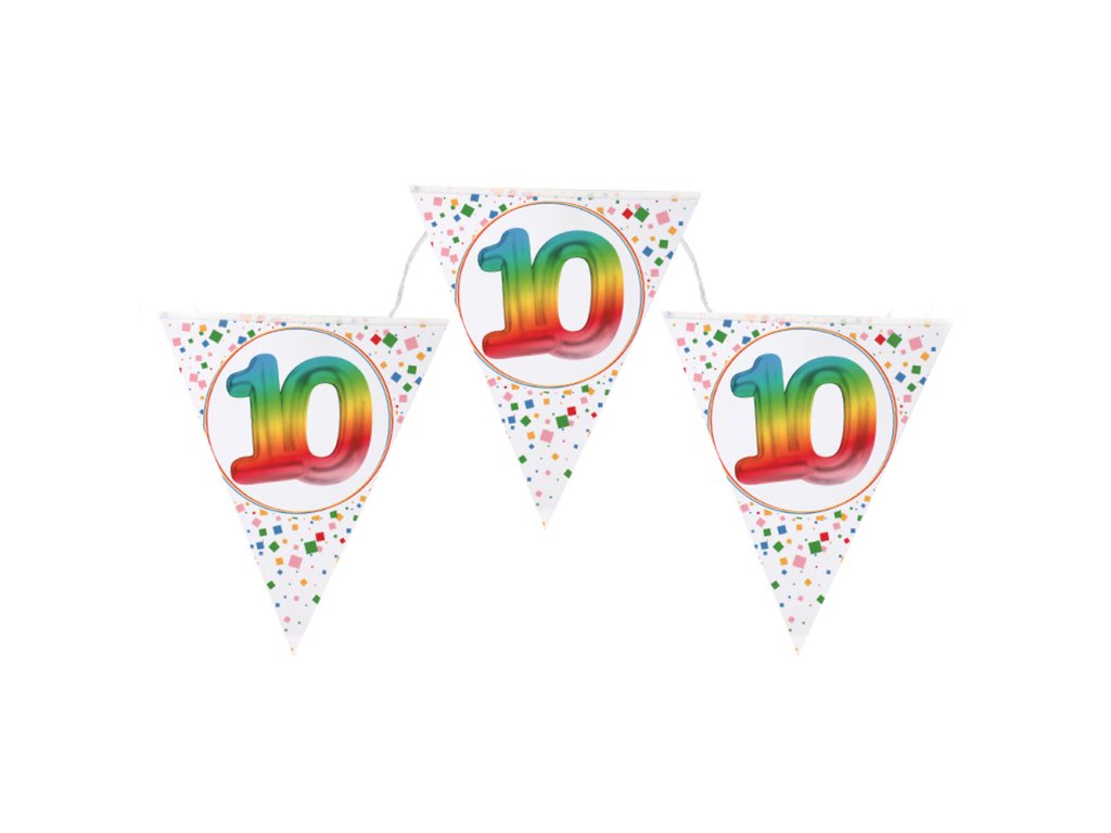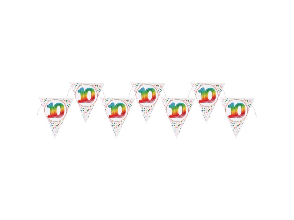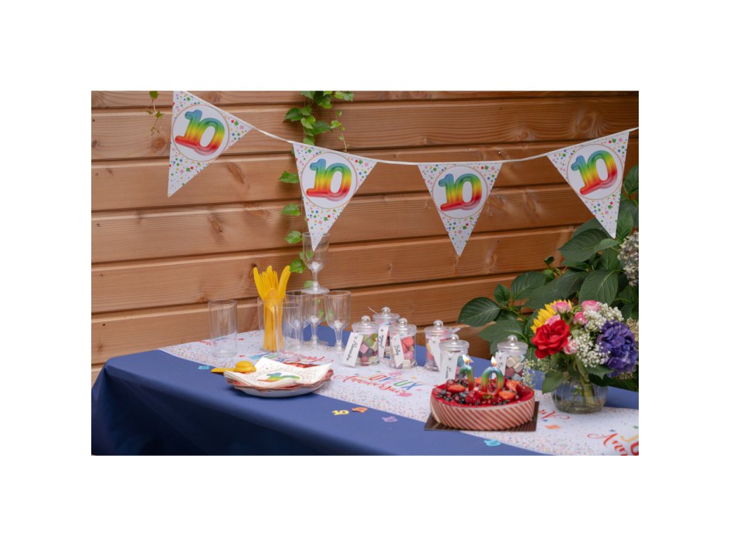 Papírové girlandy patří mezi nejoblíbenější prostorové dekorace. Vše je připraveno - stačí najít dva záchytné body a jejich zavěšení zvládnete raz dva! Na černé stuze je navázáno celkem 7 papírových vlaječek s barevným potiskem čísel 10. Velikost jedné vlajky je 22 x 26cm a celková délka 300cm. Stylová vlaječková girlanda bude už z dálky lákat hosty k místu dění. Parárdní výzdoba na oslavu kulatých 10. narozenin!