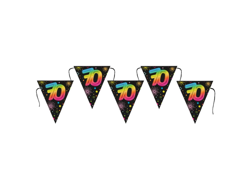 Papírové girlandy patří mezi nejoblíbenější prostorové dekorace. Vše je připraveno - stačí najít dva záchytné body a jejich zavěšení zvládnete raz dva! Na černé stuze je navázáno celkem 7 papírových vlaječek s barevným potiskem čísel 70. Velikost jedné vlajky je 22 x 26cm a celková délka 300cm. Stylová vlaječková girlanda bude už z dálky lákat hosty k místu dění. Parárdní výzdoba na oslavu kulatých 70. narozenin!
