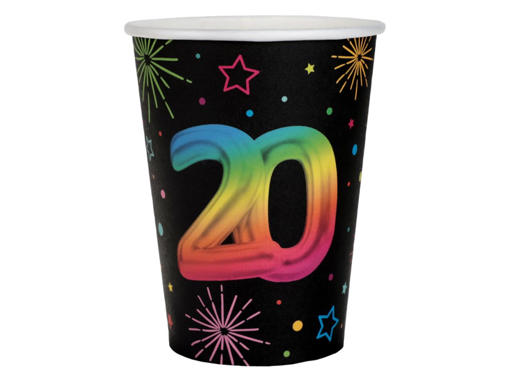 Uhaste žízeň stylově! Papírové kelímky s číslem 20 se budou krásně vyjímat na Vašem slavnostně prostřeném party stole. Servírovat v nich můžete jak teplé, tak i studené nápoje. Jednorázové papírové nádobí bezesporu oceníte také při úklidu, který zvládnete raz dva! Papírové kelímky naplníte oblíbeným nápojem o objemu až 270ml a v jednom balení na Vás čeká 6 kousků. Kelímky lze velice snadno sladit s dalšími party doplňky, jako jsou talíře, kloboučky nebo balónky. Skvělá výzdoba na oslavu dvacátých narozenin!