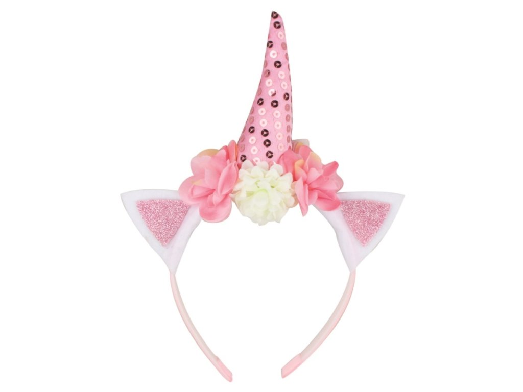 - s třpytivými oušky, flitrovým růžovým rohem a textilními květy