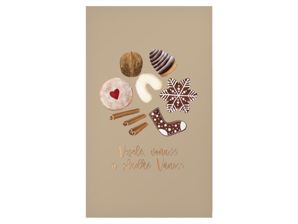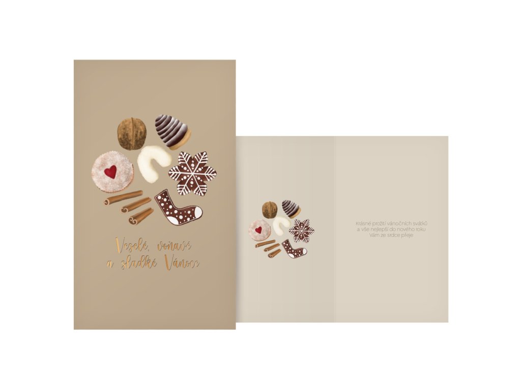 Toto elegantní vánoční přání s motivem vánočního cukroví je perfektní způsob, jak svým blízkým popřát veselé a sladké Vánoce. Je ideální pro ty, kteří ocení tradiční vánoční motivy a jednoduchou, ale přitom elegantní formu přání.