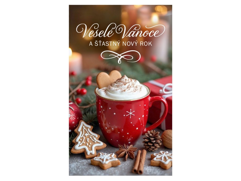 Malé vánoční přání s vůní čokolády a perníčků. Přání, které v sobě skrývá tu nejpříjemnější stránku Vánoc – teplo domova, vůni koření a chvíle klidu. Na obálce září červený hrnek se šlehačkou, obklopený perníčky, skořicí a svíčkami, které společně vytvářejí atmosféru opravdové pohody.