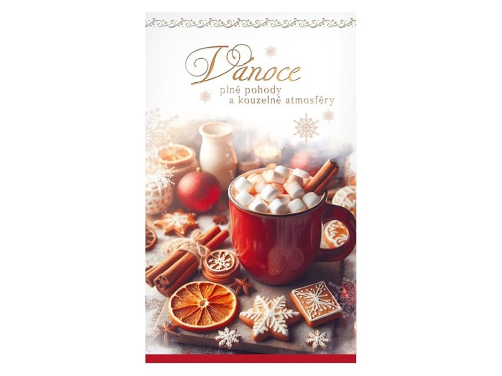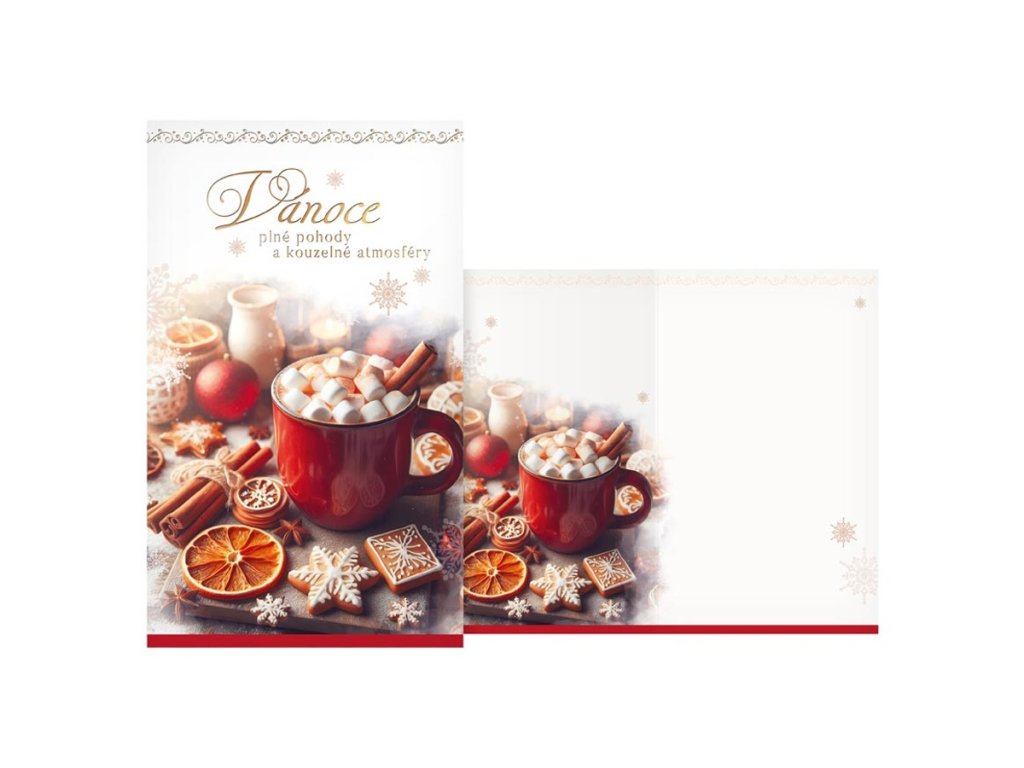 Vánoční přání s hrníčkem horkého nápoje a zimním kořením je ideálním způsobem, jak vyjádřit své přání krásných svátků a radostného nového roku. Vánoční přání je uvnitř bez textu, což vám dodává možnost napsat svůj vlastní osobní vzkaz a vytvořit tak unikátní poselství přesně na míru těm, kterým ho posíláte. Perfektní pro přátele, rodinu i kolegy, kteří ocení krásné, tradiční a osobní vánoční přání.