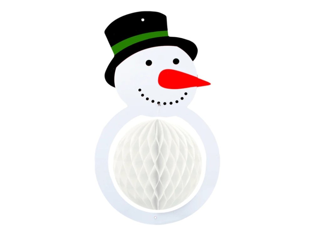 Veselá vánoční dekorace ve tvaru sněhuláčka s 3D papírovou koulí místo bříška. Ozdoba je velká 22 x 35cm, koule má průměr 14cm a v balení na Vás čeká 1 kousek. Papírovou kouli jednoduše rozvinete jedním tahem a zajistíte přiloženými svorkami. Dekorace je opatřena provázkem pro snadné zavěšení.