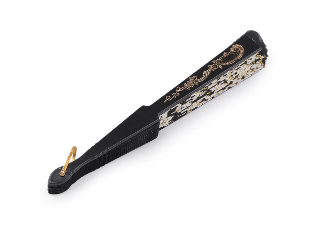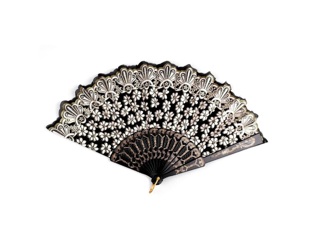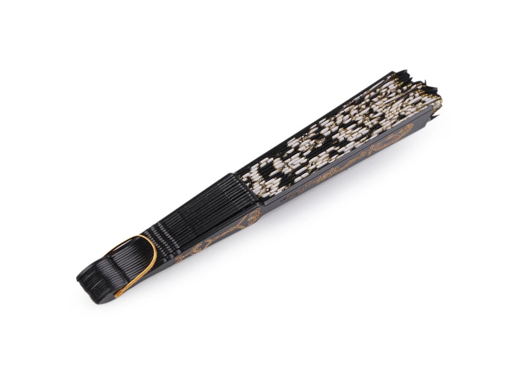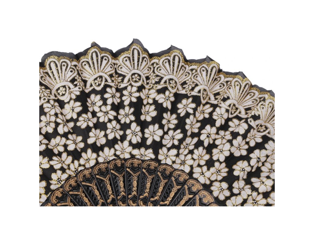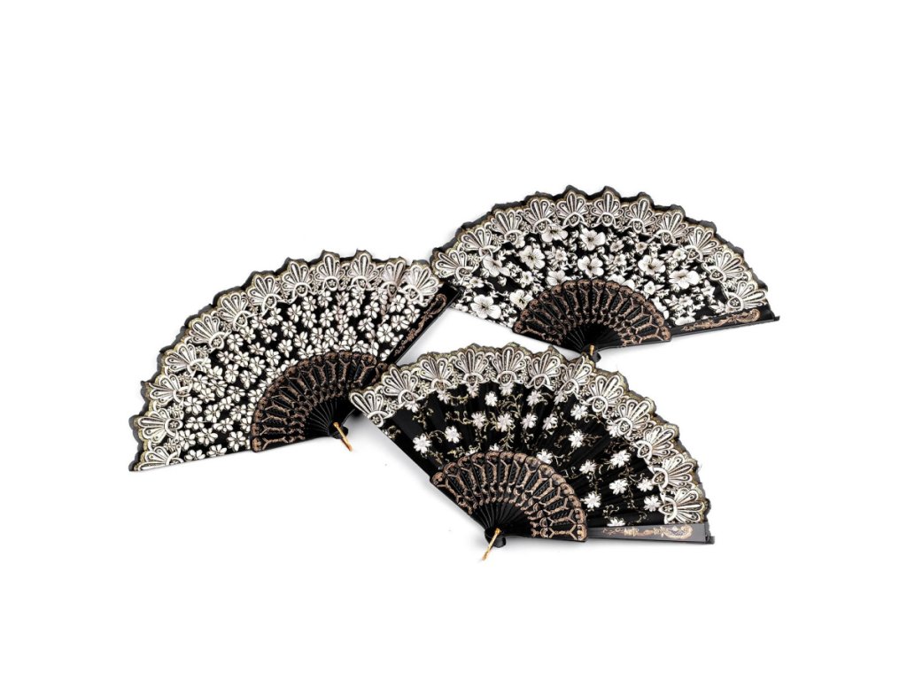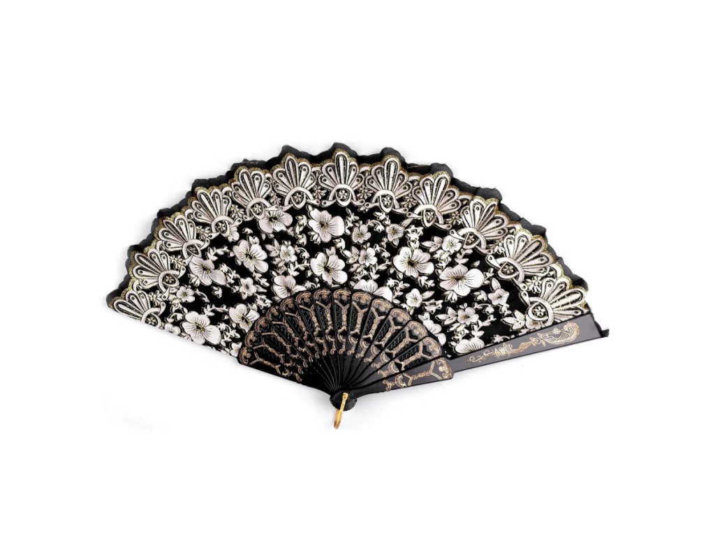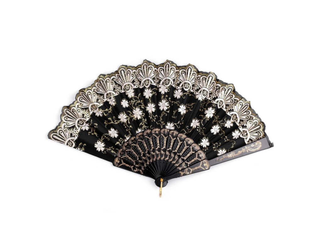 Textilní vějíř s elegantním potiskem květů zdobený zlatými glitry. Využijete jej na společenské události, svatby, karnevaly i různá taneční vystoupení. Rukojeť je plastová s kovovým poutkem. Vějíř se může stát elegantním doplňkem pro večerní procházky nebo dovolenou v exotických destinacích. Je nejen módním doplňkem, ale i praktickým pomocníkem v horkých letních dnech. Přinese Vám příjemné osvěžení a zvýrazní Váš osobní styl. Dodáváme v mixu květinových vzorů, dle aktuálních skladových zásob.